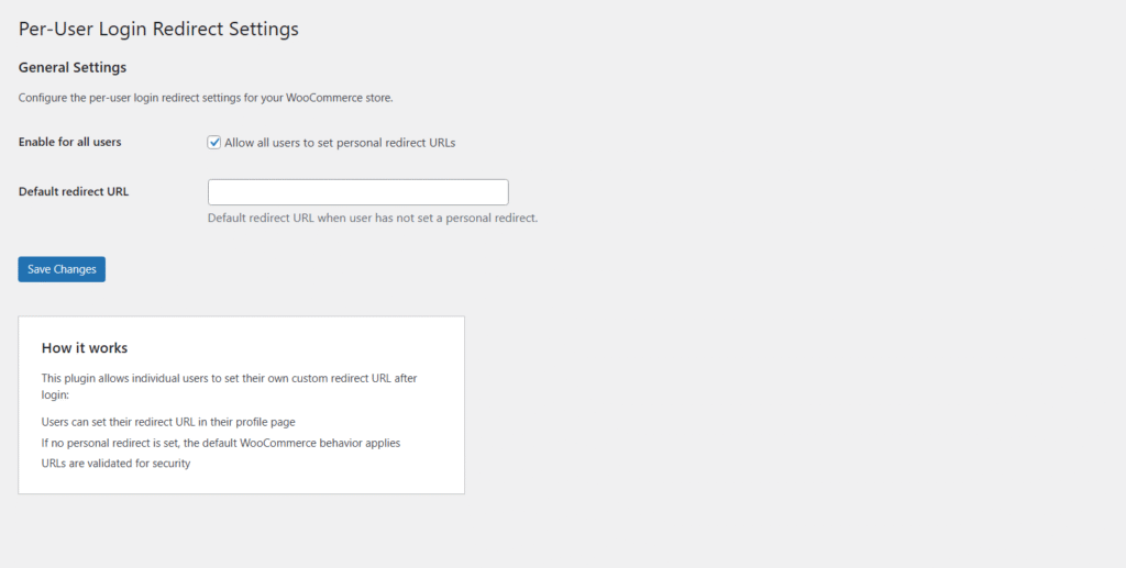 Built to give WooCommerce store administrators granular control over user login destinations. Many store owners need to direct different users to specific pages after login (member areas, personalized dashboards, onboarding flows) but lack the ability to do this on a per-user basis. This plugin empowers administrators to create tailored user experiences by setting individual redirect URLs while maintaining centralized control and security standards.